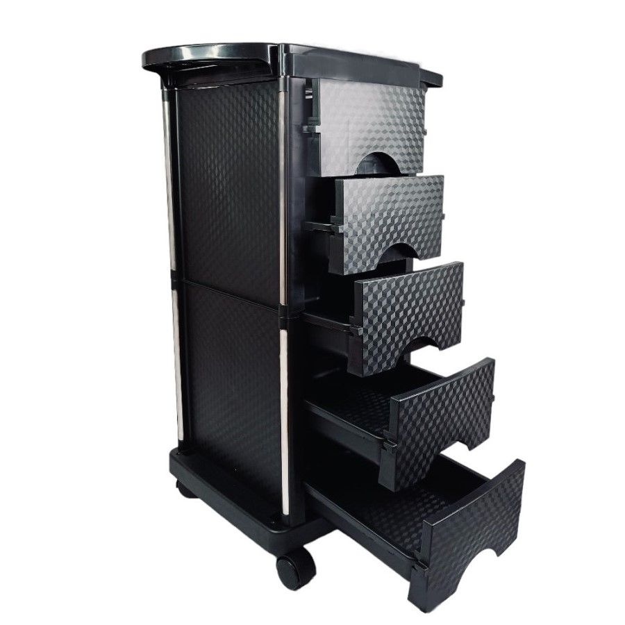 - Верхняя часть тележки - разделена на отсеки для парикмахерского оборудования. В ней предусмотрены выдвигающиеся 5 глубоких ящика (размеры ящика 33 х 22 х 7 см) под косметику, расходники, краски для волос и аксесуаров для наращивания, маникюрных принадлежностей.
