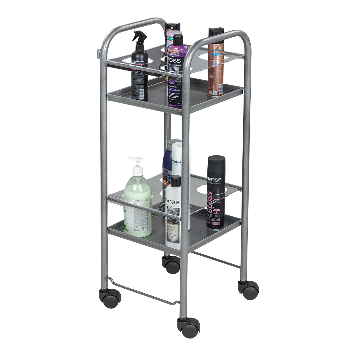 Парикмахерская тележка включает 2 полки, на которых предусмотрено по 5 отверстий для высоких флаконов.