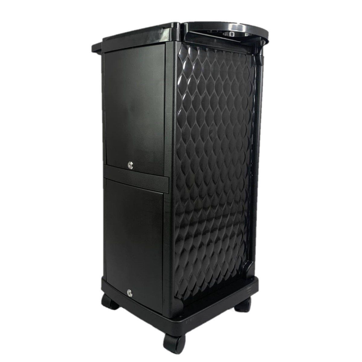 Профессиональная тележка для парикмахера T 18 черная. Тележка парикмахерская для мастера выполнена из красивого фактурного матового черного пластика на прочном металлическом каркасе.